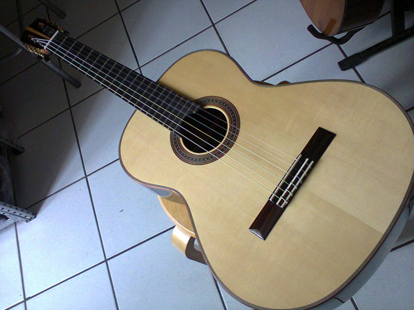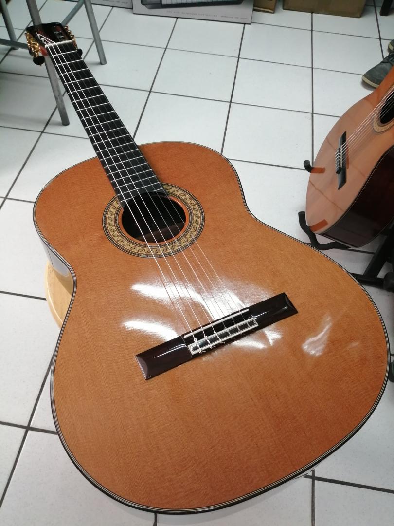 GUITARE CLASSIQUE NATURELLE VERNIE. TABLE CEDRE MASSIF. DOS ECLISSES TOUCHE CHEVALET PALISSANDRE MASSIF. MANCHE ACAJOU. MECANIQUE OR
