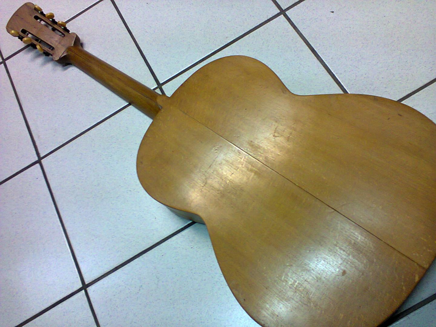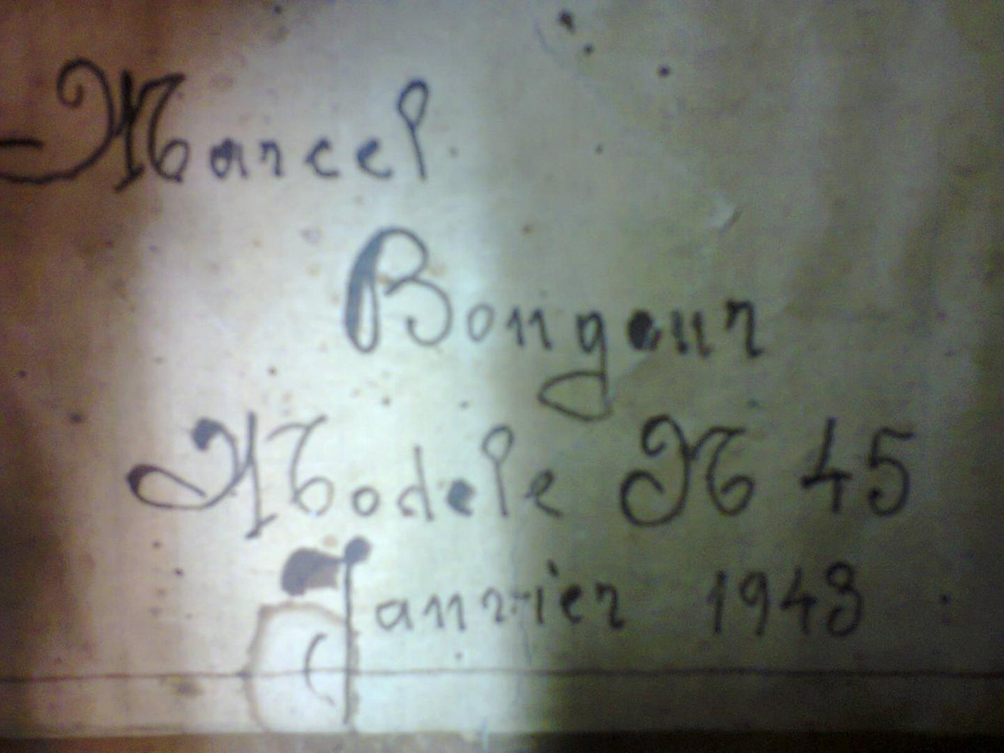 MARCEL ''BONGEUR'' M45 - 1943 GUITARE ACOUSTIQUE JAZZ MANOUCHE ARTISANALE FAITE A LA MAIN EN France PAR MARCEL ''BONGEUR'' EN JANVIER 1943 ENTIEREMENT BOIS MASSIF. C'est une petite "grand-mère" de 80 ans aussi étonnante que rare ! Tout est fait avec beaucoup de goût et dans le détail, cordier, touche, la tête et le manche (de pioche en "V"). Très bonne jouabilité et projection sonore. Malheureusement, aucun historique sur ce luthier.