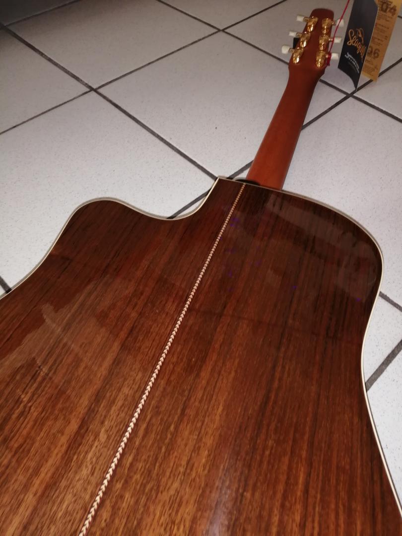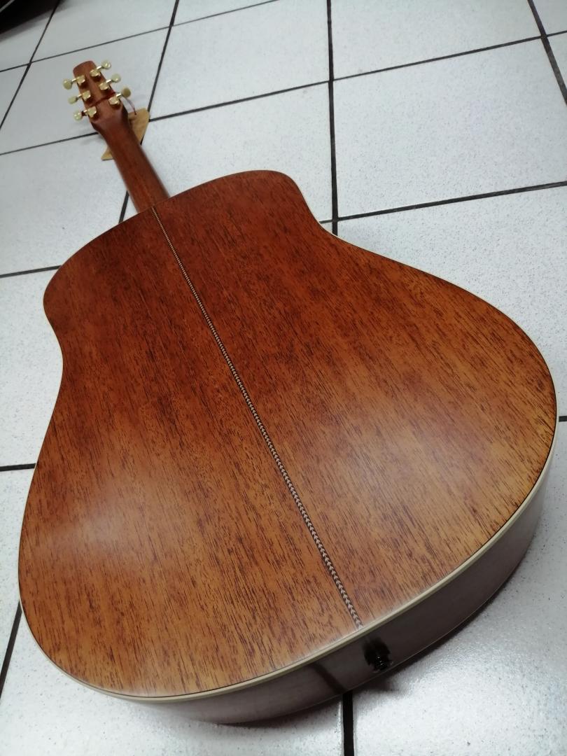 GUITARE ACOUSTIQUE **FAITE AU JAPON** NATUREL BRILLANT. TABLE EPICEA MASSIVE. MANCHE ACAJOU. DOS ECLISSES CHEVALET TOUCHE PALISSANDRE. PLAQUE ECAILLE